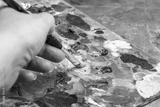 Artist's hands with old used brushes in an artist's studio, palette with multi-colored spots of oil or acrylic paint