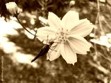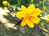 Yellow Flower with Bee in Garden. Cosmos sulphureou is a flowering plant that originates from Mexico. This plant also provides a natural habitat for the insect Anagrus nilaparvatae.