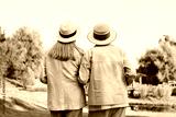 Senior women standing backs outdoors, watching beautiful natural landscape, enjoying peaceful moment, wearing stylish light clothes and straw hats, concept of friendship and active retirement travel