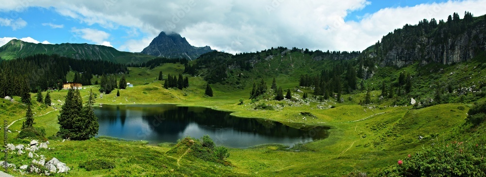 Austrian Alps - panoramic view of Lake Körbersee and Widderstein mountain in the Lechtal Alps