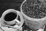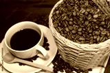 Hot coffee with coffee beans bucket