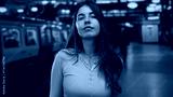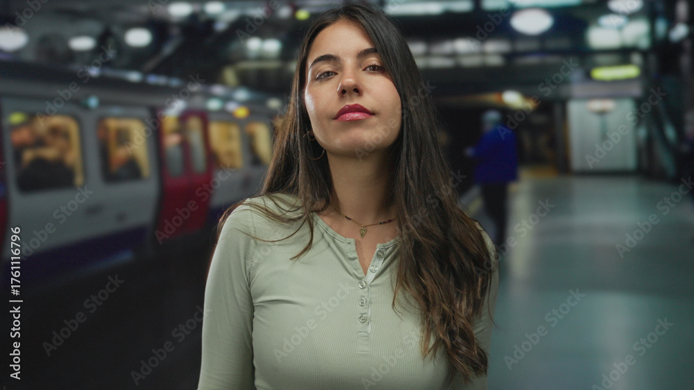 Young hispanic woman hand on chest and raised palm gesture in building train station platform with carriage visible; solemnity.