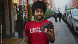 Lifeguard man with binoculars stands smiling on a busy city street showcasing a vibrant scene of urban life and personal expression.