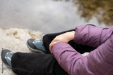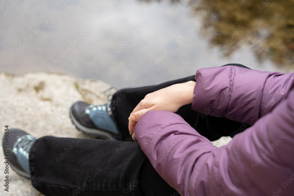 woman resting outdoors by lake, contemplating nature