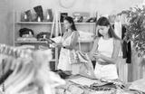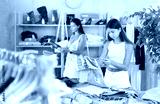 Teen girl customer choose denim jeans or shorts in store, and buyer carefully examines product. Client elect between several trousers options and plans to purchase summer clothes during discount