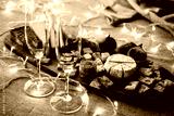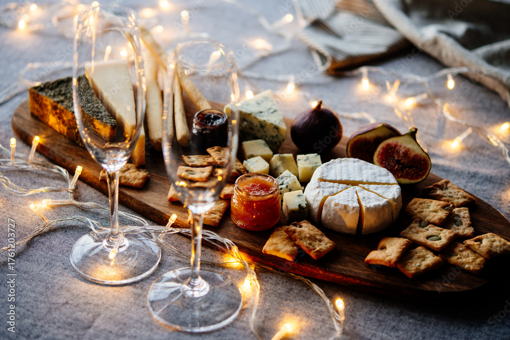 Wooden board with different kinds of cheese and appetizers served for dinner or party.