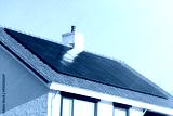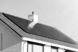 Solar panels cover a terracotta tiled rooftop under bright sunlight and clear blue sky.