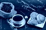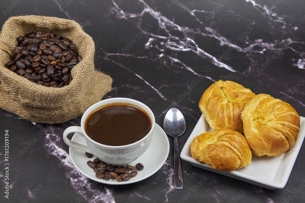 Cup of coffee, close-up, with freshly roasted beans and a croissant to enjoy, copy space and foreground photo.