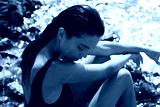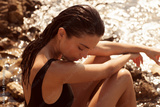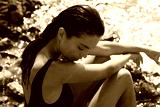 Beautiful girl is posing on the rocks and stones at the seaside.
