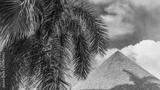 The crown of a royal palm tree Roystonea regia and triangular thatched roofs against a background of blue sky and clouds. Lush spreading green leaves. A sunny day. Cuba. Varadero.