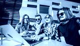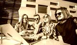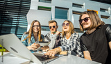Group of students have study talk on table with laptop and books before modern building, sunny day