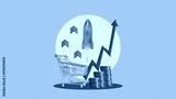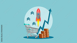 Increase Sales Revenue or profit. Marketing strategy for the Sale growth concept. Collage with supermarket trolley and rising stocks of coins