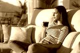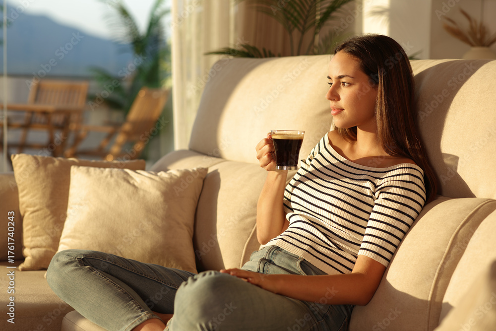 Woman relaxing drinking coffee on a couch at home