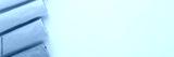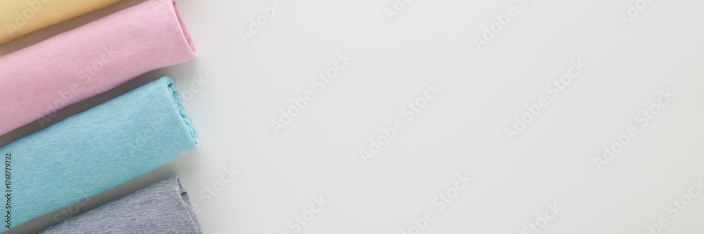 Rolled colorful t shirts on light gray table background. Making clothes neatness. Wide banner. Closeup. Empty place for text. Top down view.