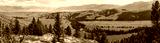 Panoramic view of the mountain ranges, spacious valley and pine forests