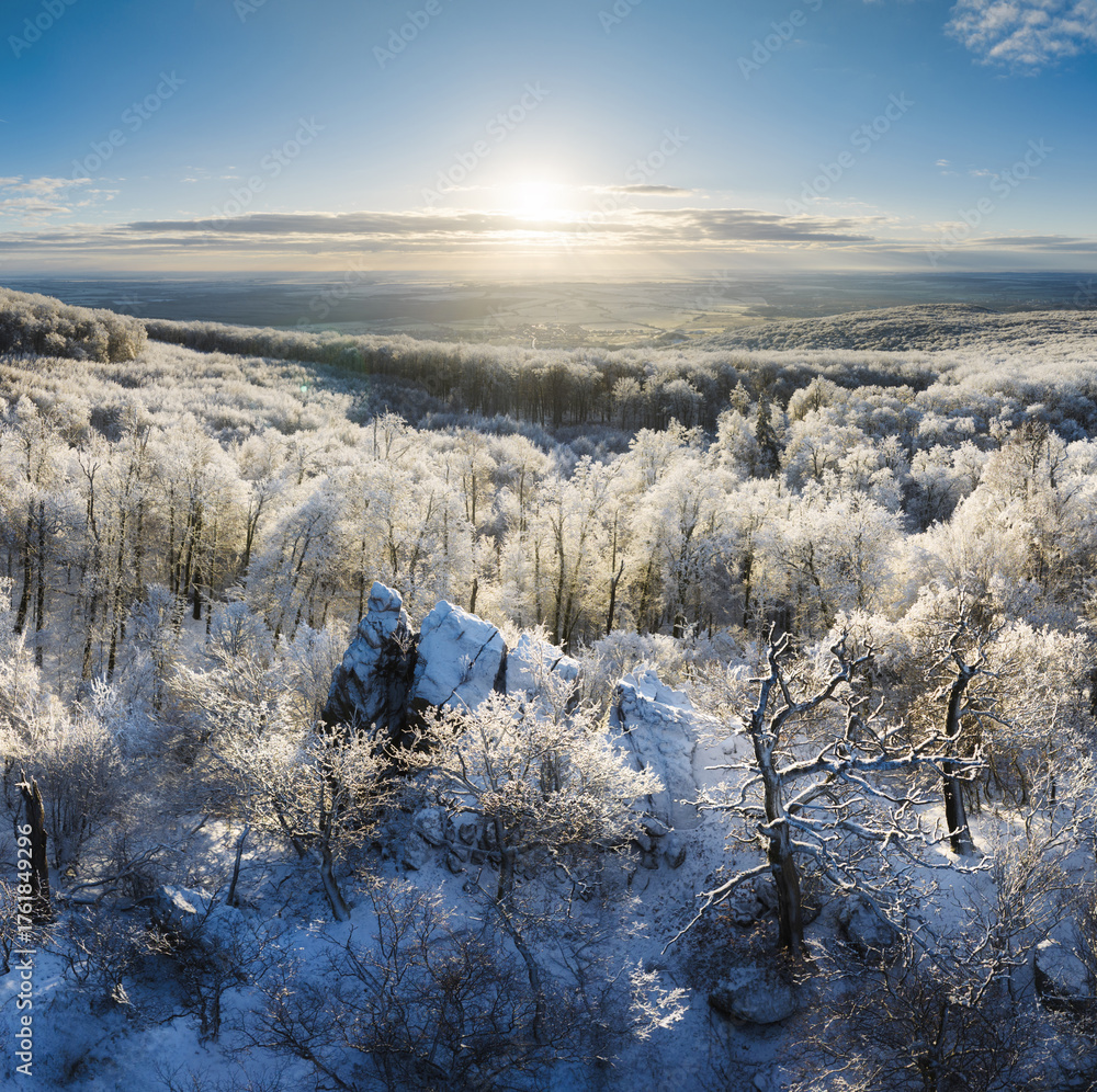 winter panorama landscape with forest, trees covered snow and sunrise. winterly morning of a new day. purple winter landscape with sunset, panoramic view