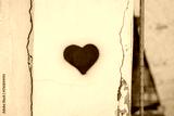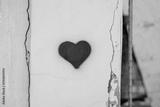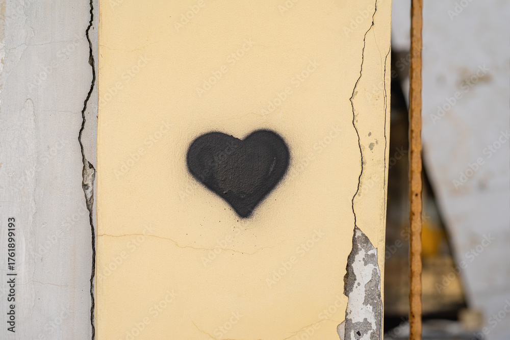 Black heart graffiti is painted on a cracked beige wall. grunge texture, creative urban art background. Concept of love, heart, imperfection within street art