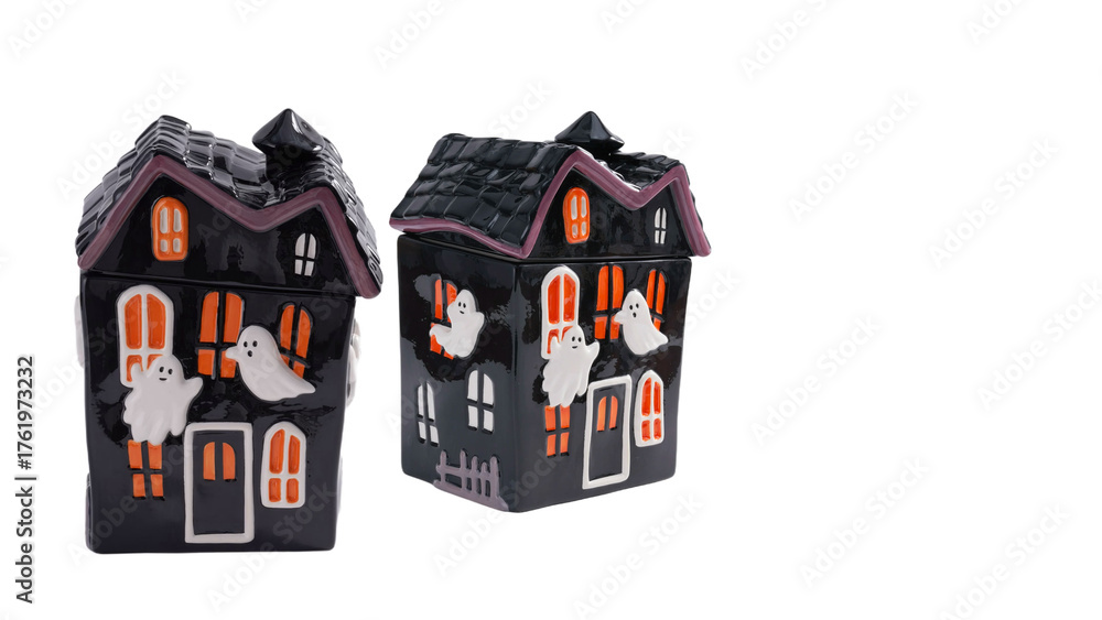 Spooky ceramic haunted house vases with ghost designs perfect for Halloween decoration.