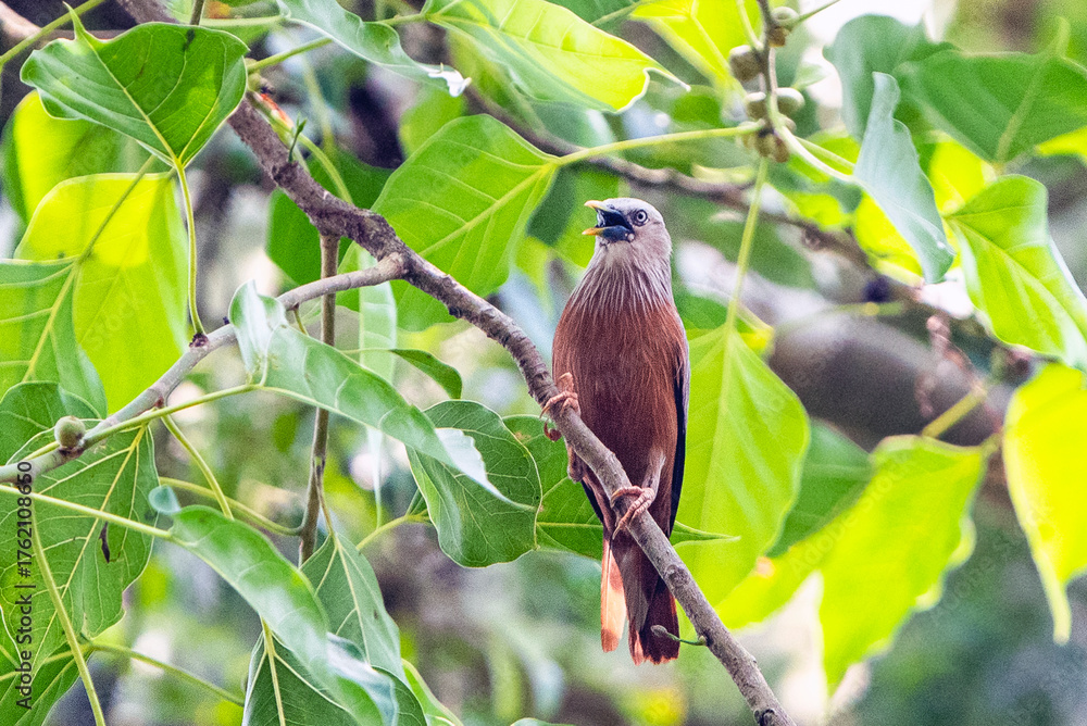 A Chestnut-tailed Starling Bird Perched on Branch Among Green Leaves in Outdoor Nature Scene