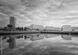 Beautiful waterfront scene in Le Havre, France at sunset. Buildings are perfectly reflected in the still water
