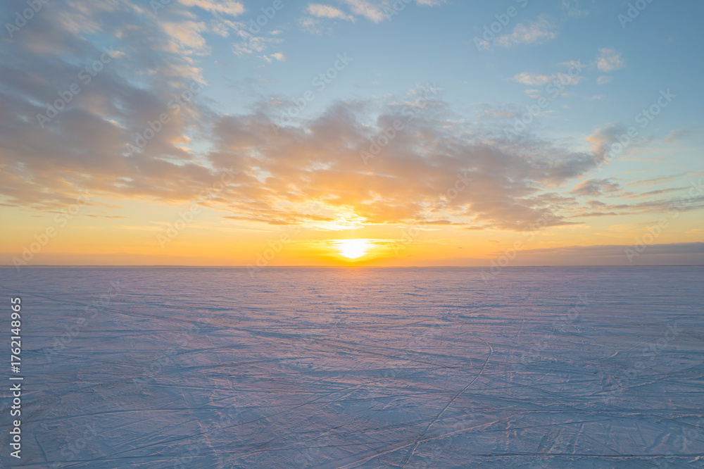 Beautiful winter sunset over a vast frozen and snow-covered plain.