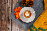 A cozy autumn scene with a ceramic mug of coffee on a wool knitted scarf, surrounded by golden leaves. Perfect for depicting warmth, relaxation, and seasonal comfort in fall settings.