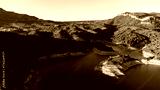 Aerial view of a mountain reservoir in Spain with turquoise water surrounded by forested hills, rocky shores, and a dam under clear skies