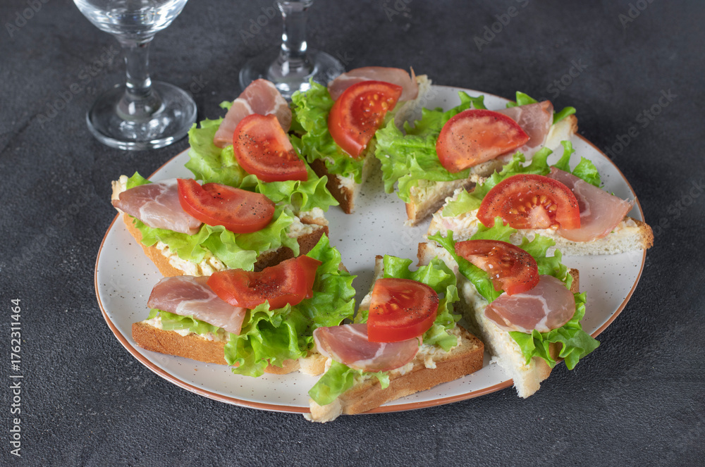 Homemade sandwiches with bacon, tomato and lettuce on white plate