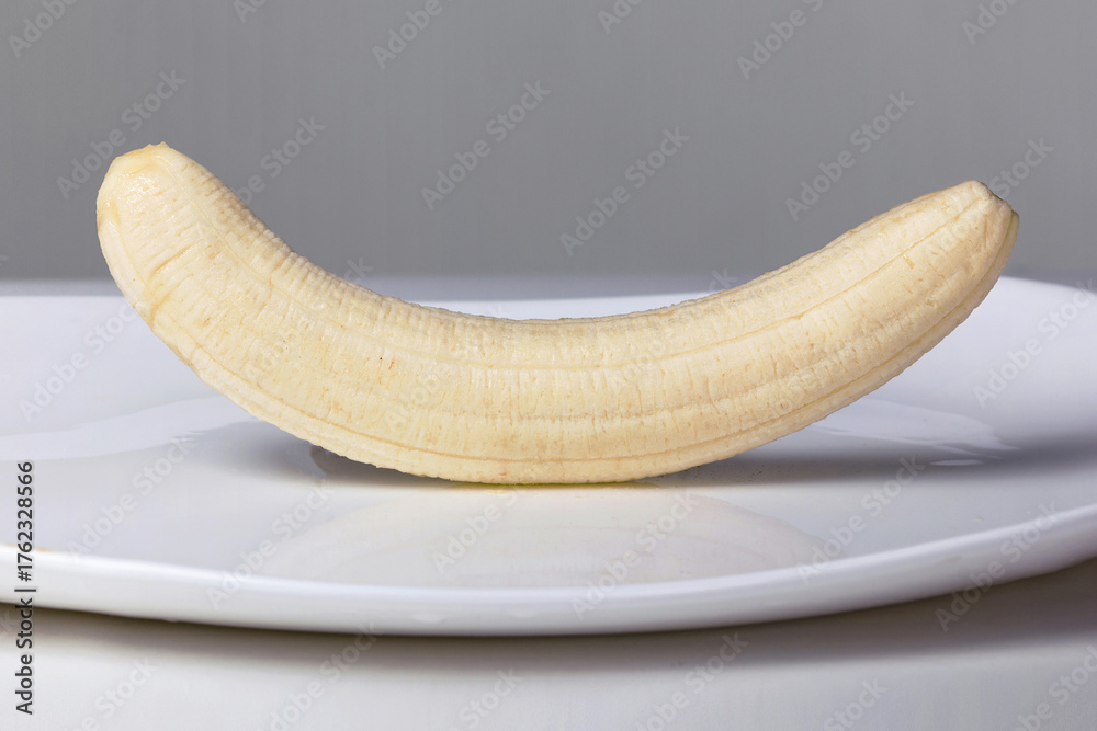 A close-up of a banana lying on a glossy white plate, which will soon be doused with chocolate. T-series of 9 photos, the first photo.