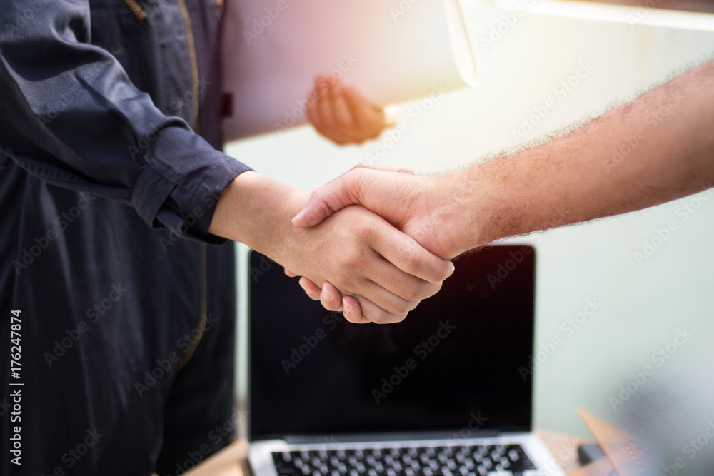 engineer shaking hand with with colleagues to cooperate and deal in business successful.
