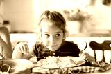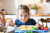 Child eating pasta and cheese at home kitchen. Cute kid girl enjoying delicious family lunch, healthy comfort food, homemade traditional Italian dinner. Authentic, candid lifestyle moment