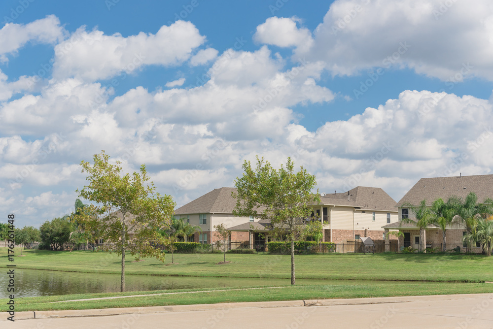Walking pathway alongside leads to residential houses by the lake in Pearland, Texas, USA.