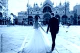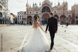Bride and groom hold their hands together walking on the square in Venice