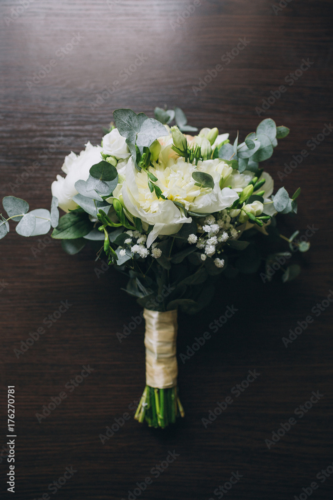 Classy wedding bouquet made of white flowers and greenery lies on the table