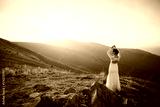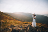 Bride stands on the rocks before beautiful landscape in the rays of evening sun