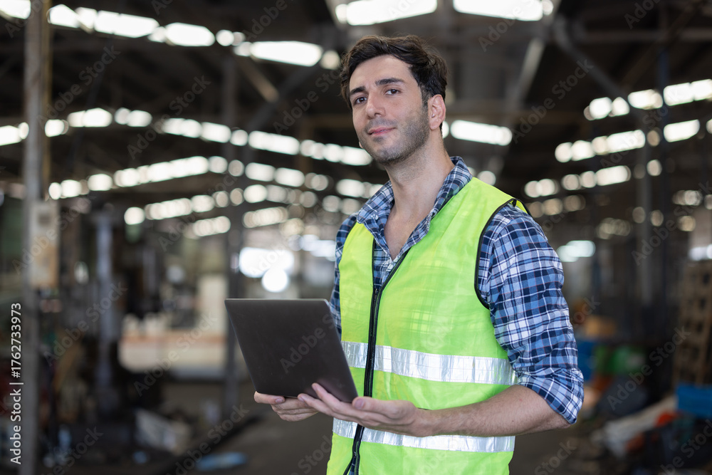 Factory male worker. Engineer man worker working with labtop checking working in industrial manufacturing factory, men at work to checking equipment of machinery production technology or construction.