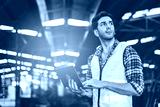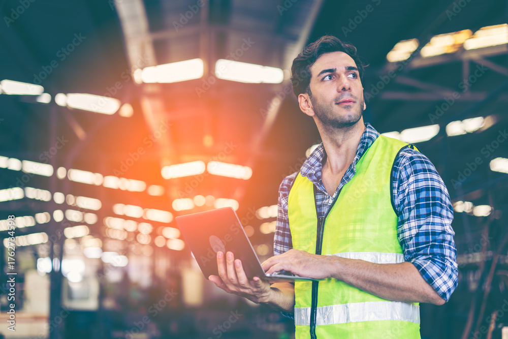 Factory male worker. Engineer man worker working with labtop checking working in industrial manufacturing factory, men at work to checking equipment of machinery production technology or construction.