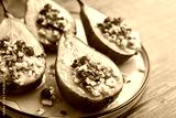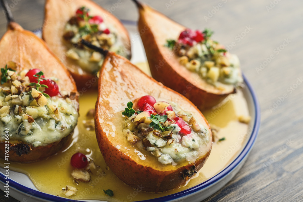 Delicious baked pears with nuts, blue cheese, thyme, cranberry and honey