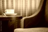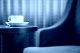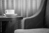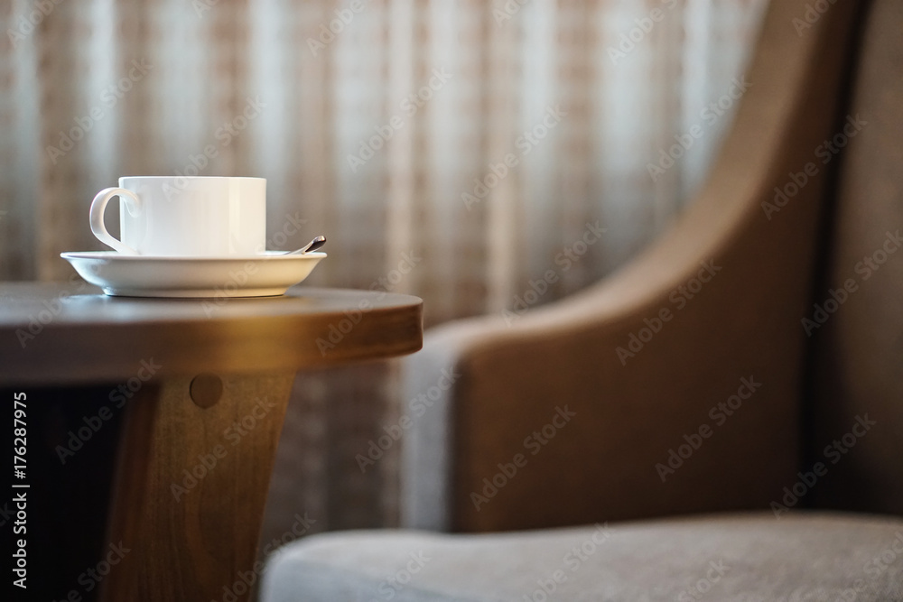 white coffee cup on the table by a sofa couch in hotel room