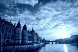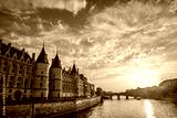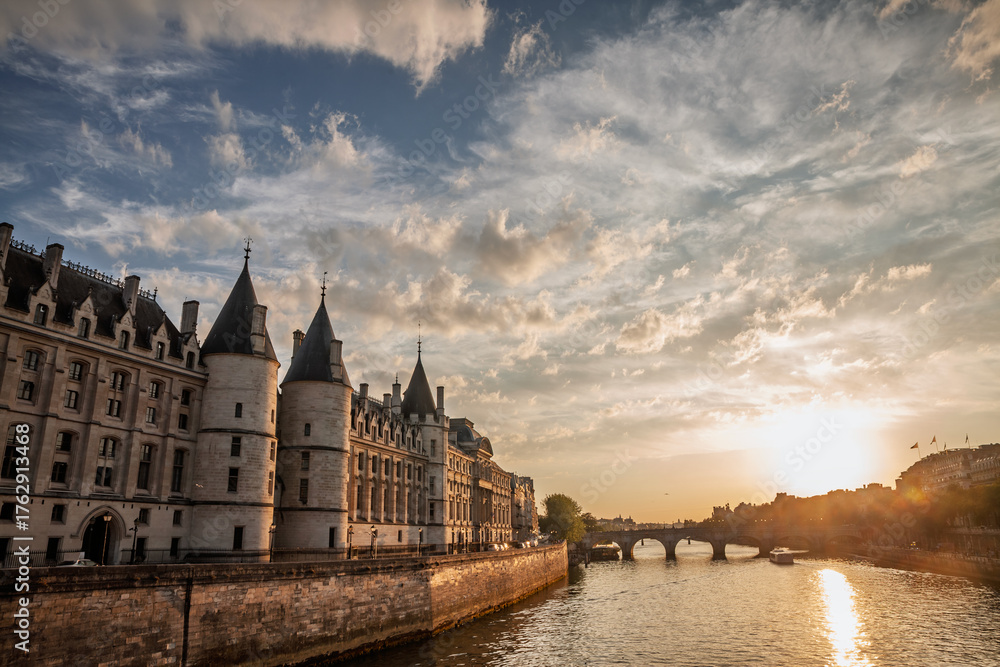 La Conciergerie along the Seine with Pont Neuf at dusk in Paris. The medieval palace and former prison stands by the river as the sun sets, a former prison is a major attraction on Ile de la Cité.