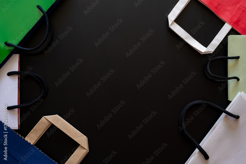 Black Friday concept with colorful shopping bags with handles border a dark background for sales and promotions.