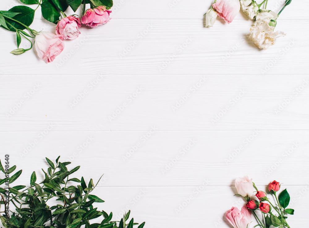 Spring flowers. Pink flowers on white wooden background. Flat lay, top view.