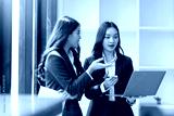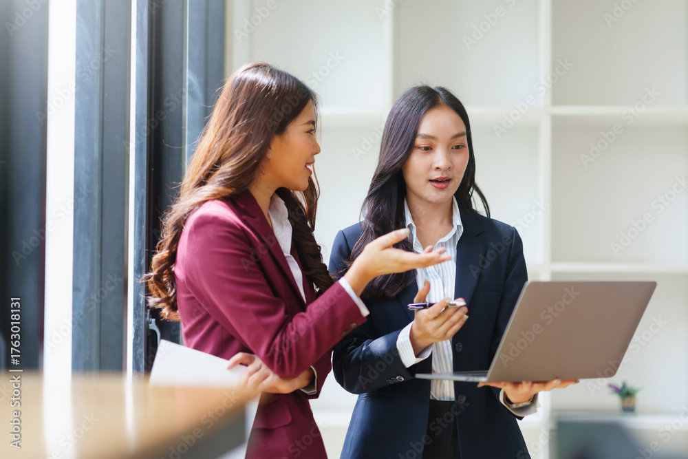 Two professional businesswomen collaborating and sharing ideas during an informal meeting, looking at a laptop screen in a modern office