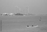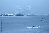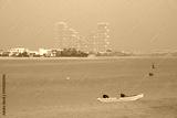 Waterfront and coastal scenes featuring water activities, paddleboards, boats, and urban skylines during different times of day, with reflections on the water and modern city architecture in the back.