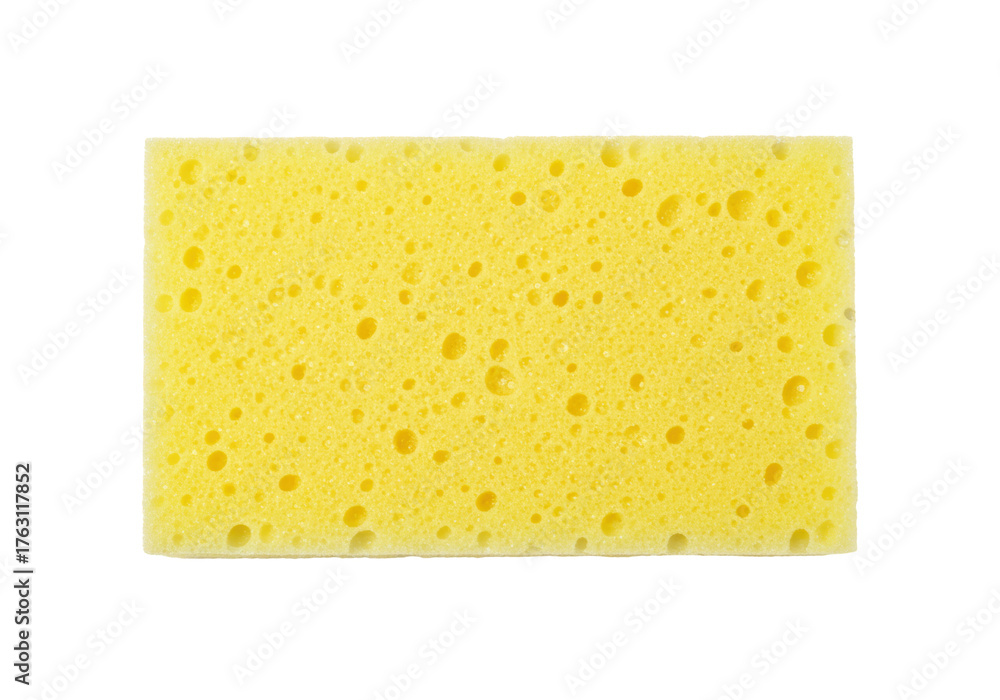 Yellow porous sponge isolated on transparent background, cleaning tool for household chores and dishwashing