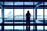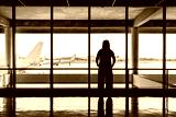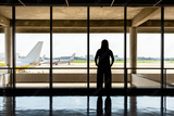 Solo traveler silhouette in a modern airport departure lounge. Woman watching airplanes from the window. Travel, vacation, and journey concept.