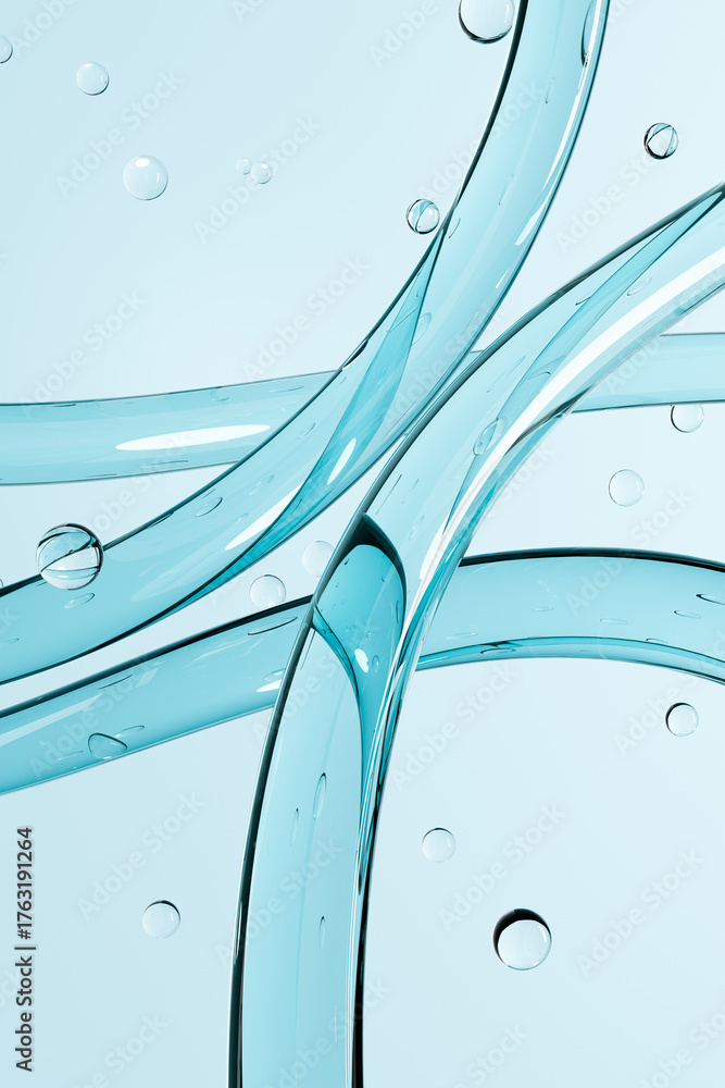 Abstract composition of transparent blue liquid tubes and air bubbles on a light background. Modern medical or cosmetic concept symbolizing purity, hydration, and fluid connection.