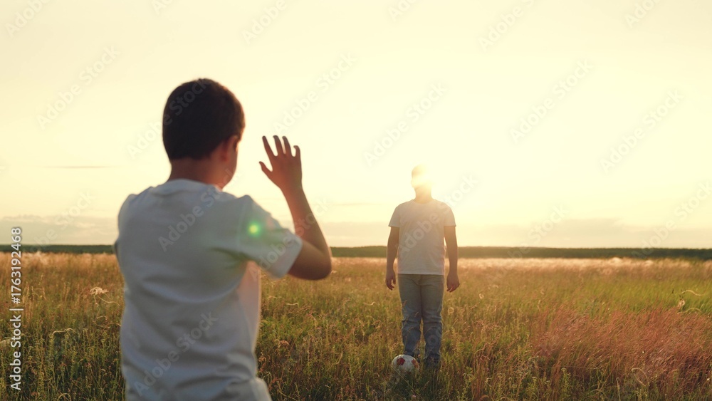 People nature, child kid playing ball lawn outdoors, happy childhood schoolchildren sunset, happy children playing soccer on a summer day., boys and their football on the playground lawn., happy