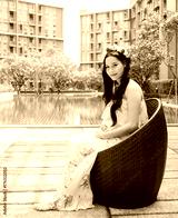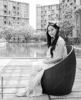 Asian beautiful woman is pregnant sitting on chair at swimming pool