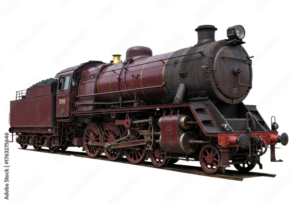 Isolated view of a classic steam train engine on tracks, vintage transport equipment